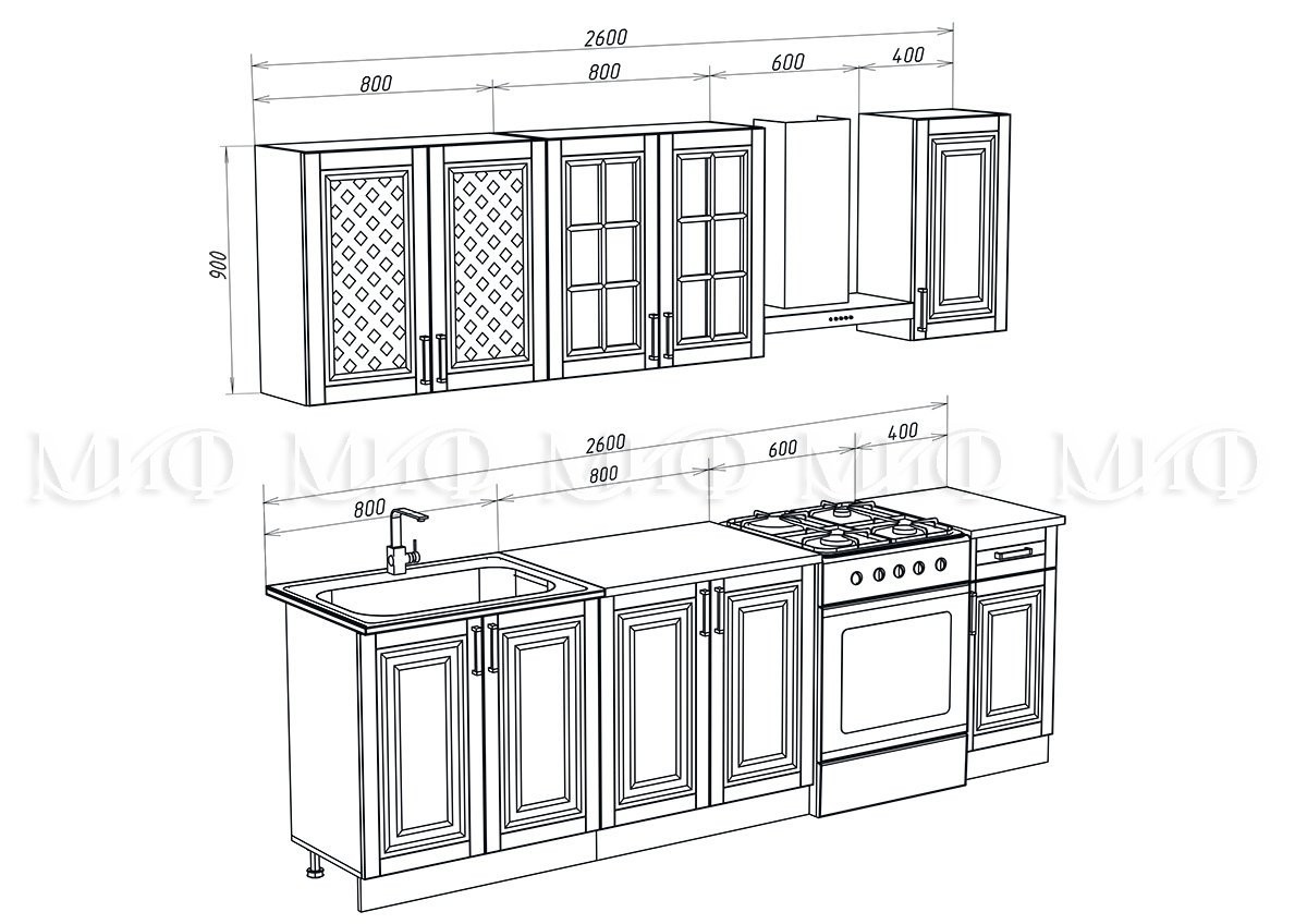 • Глубина шкафов: Верхние 300 мм/Нижние 600 мм/Глубина столешницы 600 мм